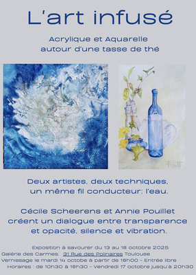 Dans cette exposition intimiste, les artistes Annie Pouillet (aquarelle) et Cécile Scheerens (acrylique) orchestrent une rencontre entre deux univers picturaux : l’aquarelle, fluide et imprévisible, et l’acrylique, dense et affirmée.
