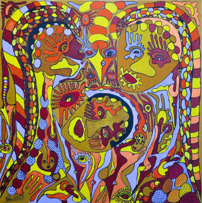 Fusion des Mondes : Ses toiles mêlent des représentations abstraites et figuratives, faisant coexister des personnages et des paysages variés.