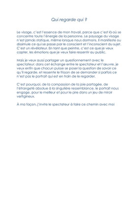 Mais je veux aussi partager un questionnement avec le spectateur : quand nous regardons un portrait, est-ce que nous cherchons une ressemblance avec une personne précise, ou bien est-ce que nous projetons notre propre visage dans celui que nous regardons. Dans cet échange entre le spectateur et l’œuvre, transje veux enfin que chacun puisse se poser la question de savoir ce qu’il regarde, et ressente le frisson de se demander si parfois ce n’est pas le portrait qui est en train de le regarder.